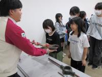 今日は初日なので,先生がたがよそってくださった給食をこぼさないように丁寧に配りました。