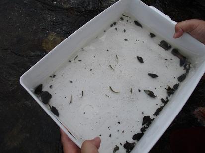 これみて!カワニナがいっぱいだよ!採集したものを見せ合っていますね!