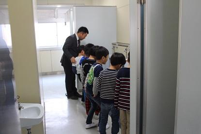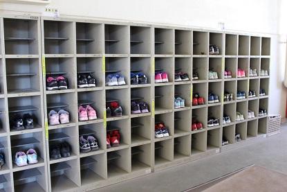 昇降口から教室に行く途中の職員室に、多くの子があいさつをしています。