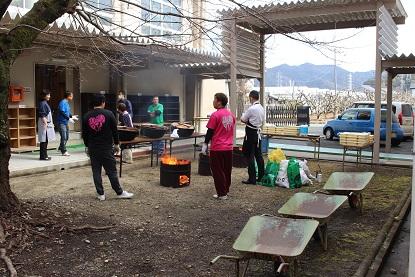先生たちの分もありがとう!自作の大きなシャモジをつかってみんなでしっかり混ぜています!みんなのカレーは、とても、とっても、と~~ってもおいしかったよ。