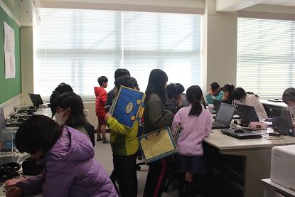 先月、4年生と5年生は嵩山小へ行き、総合的な学習の発表交流やプログラミング学習をしてきました。