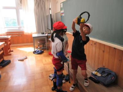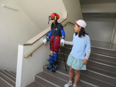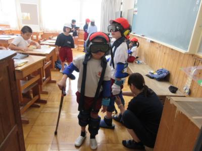 また同時に,手足に重りをつけたり,イヤーマフやゴーグルをつけて「高齢者疑似体験」もしました。