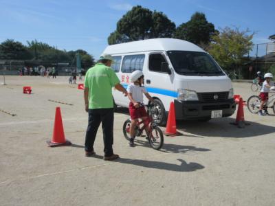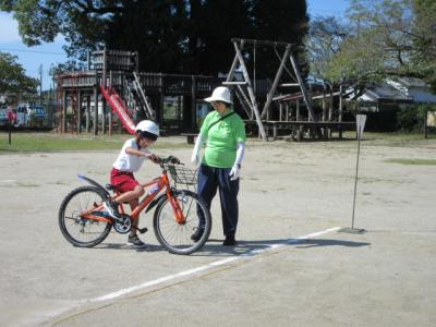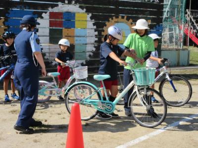 子どもたちは家から運んできた自転車を使って,発進の仕方から横断歩道の渡り方まで,安全に乗車できるように丁寧に教えていただきました。