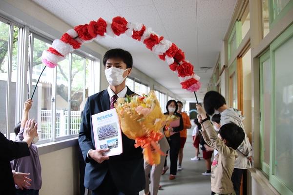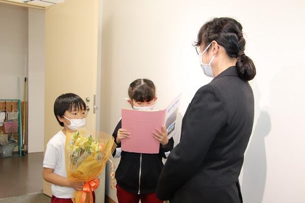 「今日は会えるんだね」と朝から心待ちにしていました。コロナ感染予防のため、TV放送で行いました。代表児童がお別れの言葉を発表し、花束とみんなが書いたお手紙を手渡しました。