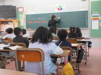 昔の学校の様子を、今もな昔の姿が残る教室でお話を聞きました。古多米は、戦争が終わる直前に、地域の方の熱い思いから建てられたことを知りました。このような体験ができるのは、多米校区ならではです。貴重な文化遺産の残る多米校区。地域と連携したわくわくする授業を展開しています。