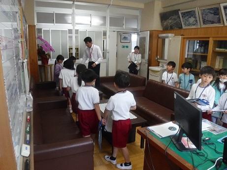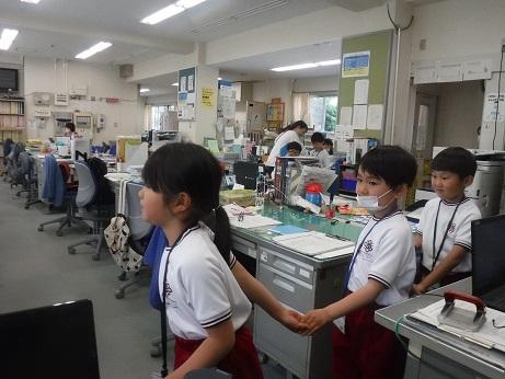 続いて職員室に入ってきました。2年生は1年生の手をしっかりつないで、お兄さん、お姉さんらしくリードしてあげています。とても微笑ましい光景でした。