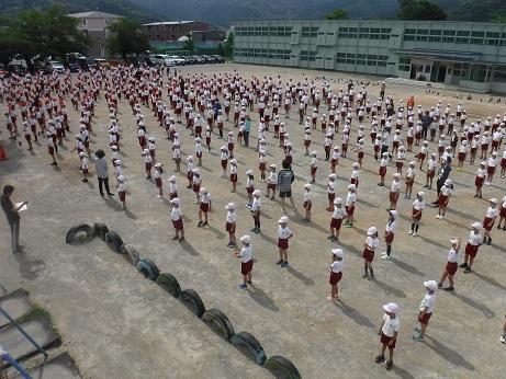 梅雨入りした影響が大きく、雨で思うように運動場が使えません。特に先週金曜日の大雨は予想を上回るもので、運動場は海のようになっていましたが、今日はしっかり晴れて、全校練習をすることができました。