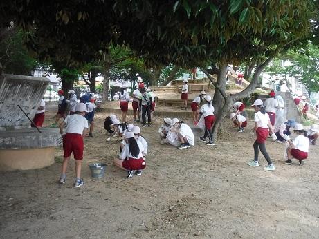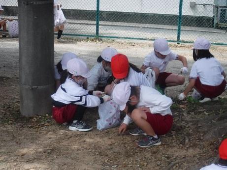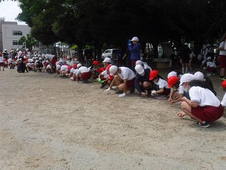 運動場の石拾いを一列になって、ペア学年で行っている様子も見られます。6年生がしっかりと1年生のお世話をしてくれていました。頼りになる6年生です。