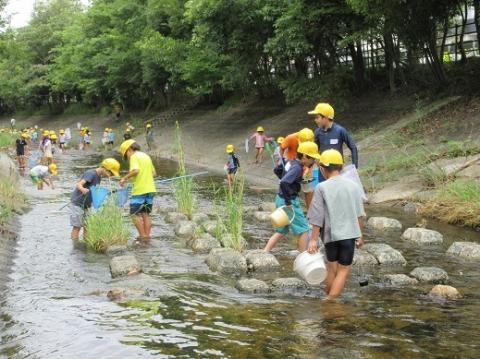 2年生が学校前の朝倉川に、生活科の学習で「川たんけん」に行きました。生き物がどんな場所にいるのか、友達と話しながら探しました。