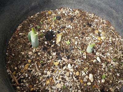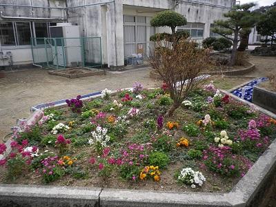中庭花壇の花が咲き、チューリップの芽も出てきています。