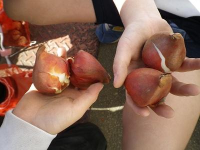 1年生から5年生がチューリップの球根を植えています。