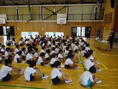 また体育館に避難した全校児童は、生活安全課の方から「つみきおに」やビデオ視聴を通して、