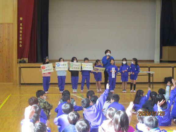 天伯小学校は、あいさつのできる子を目ざしています。第2回あいさつ革命の表彰を行いました。