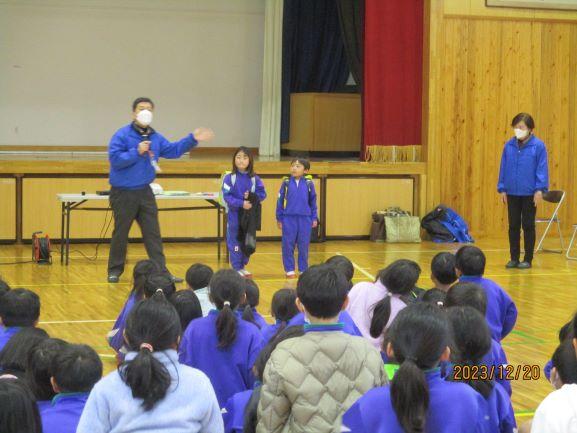 2年生5名が舞台にあがり、2学期にがんばったことや3学期にがんばりたいことを全校の前で発表しました。校長先生からは、目標に向かってどんどん挑戦し、新年を新しい気持ちで迎えられるように準備してほしいと話がありました。生徒指導担当の先生からは、乗ってはいけない車(事故やけが、不審な車)についての話がありました。