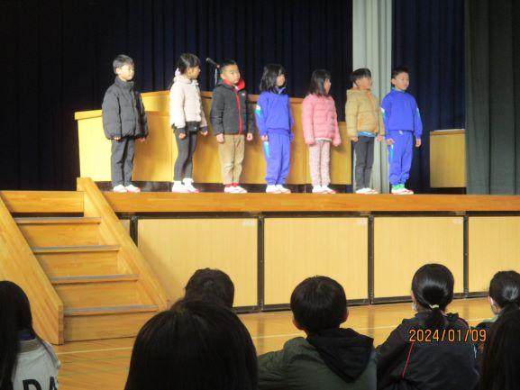 始業式では、1年生の代表児童6名が、もっとみんなと仲よくすること、漢字の練習にはげむこと、早寝早起き朝ごはんをしっかり行うことなど、3学期にがんばりたいことを発表しました。