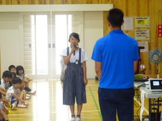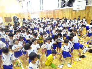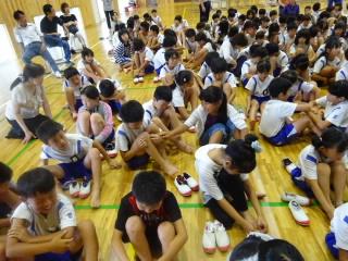 全校出校日に,3日に行われる小学校水泳大会に出場する選手の応援を全校で行いました。