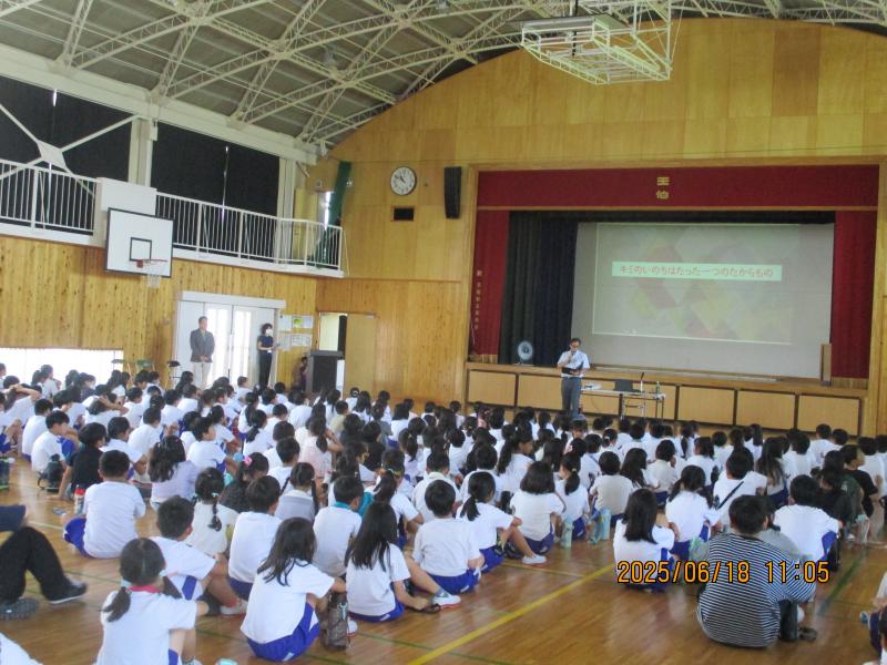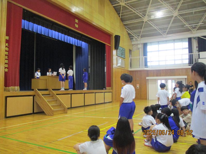 小柴記念賞など夏休みの作品コンクールの表彰を行いました。安全に通学班で並んで登校、廊下を歩く、黙働清掃など、運営委員長や生徒指導担当・安全担当から話がありました。校長先生からは、かけ足訓練で自分との勝負に勝とうと励ましの言葉をいただきました。