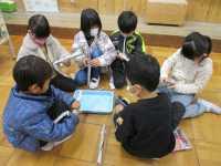 「オルガンの横は1mより短いんだね」「タブレット保管庫の高さは、1mより長いよ」と、いろいろ測って確かめました。