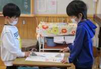 生活科では、ゴムロケットを作り、ロケットが遠くに飛ぶように工夫しました。ロケットの形や大きさ、発射台のゴムの大きさや本数で飛び方に違いがあることを見つけました。