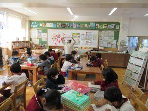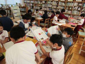国語の時間に百科事典(ポプラディア)の使い方について、司書の本間さんに教えていただきました。子どもたちは、百科事典が1~18で一巻となっていることを知り、その量の多さにとても驚いていました。言葉を調べる活動では、グループで協力して探しあう様子が見られました。