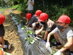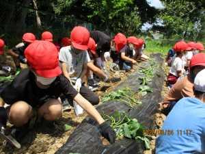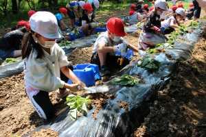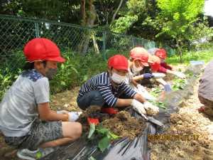 畑では、伸びすぎたいものつるを切りました。また、周りの草を抜いたり刈ったりしました。