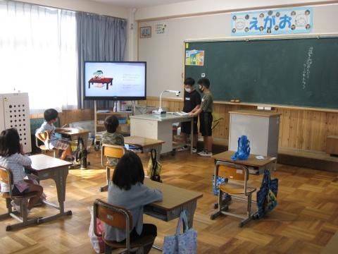 5月16日 1年生が入学して、2か月半がたち、だんだんと学校にも慣れてきました。そこで、2年生が1年生といっしょに学校の中を周りながら、学校案内を行いました。