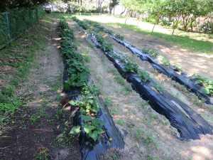 つるを切った後、黒いマルチを先生と子どもたちで上手にはがしました。