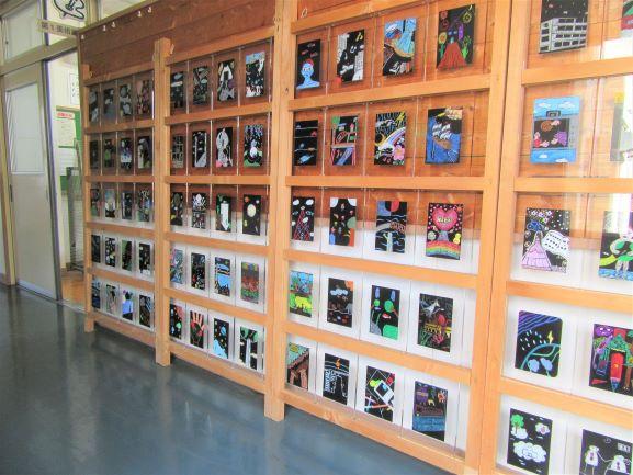 美術室前の廊下には、3年生の作品が展示されています。今年も、豊橋まつりが中止となり、子ども造形パラダイスもWEB開催となっています。