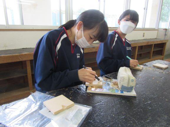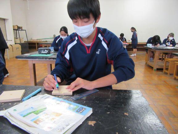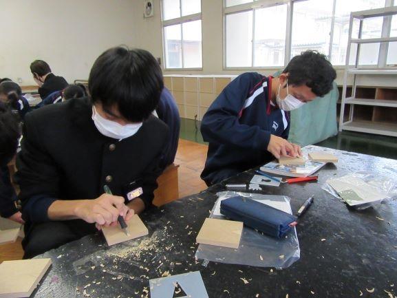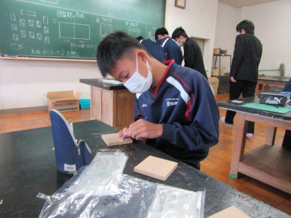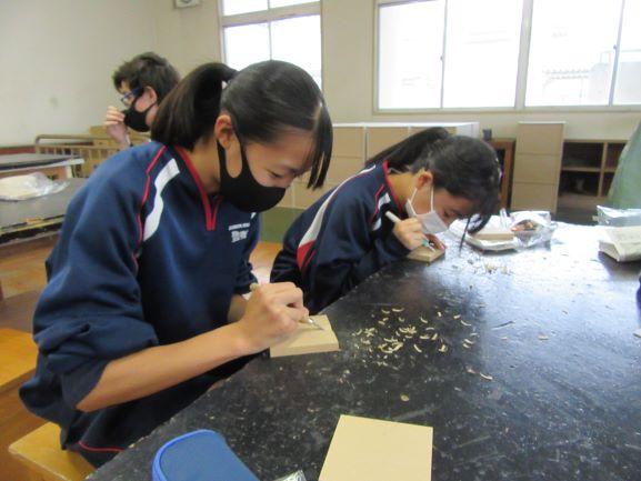 3年生の技術の授業では、木材を彫刻刀で彫っていました。キーホルダーの鋳造のために、木材に注ぎ口を作っていました。