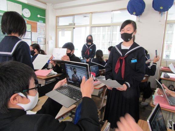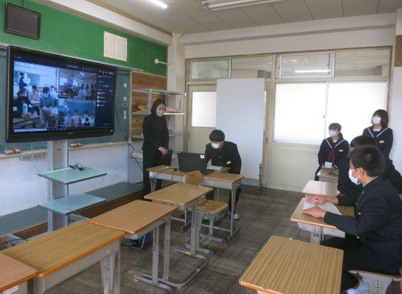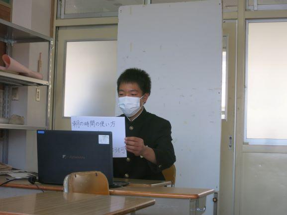 各学年の生徒の話や校長先生のお話、諸連絡をオンラインで行いました。