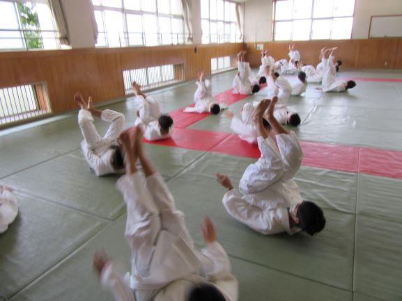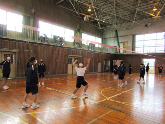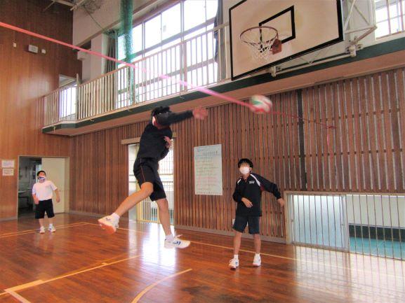 撤去作業すぐ横の体育館では、気持ちよい風を感じながら、1年生がマット運動の授業をがんばっていました。