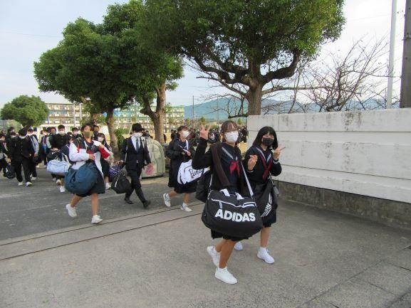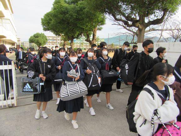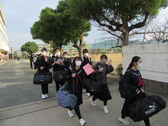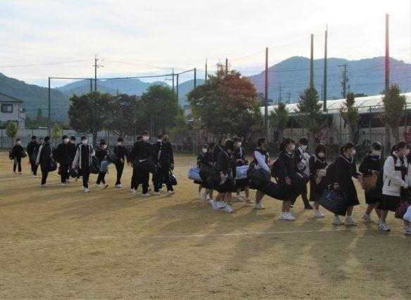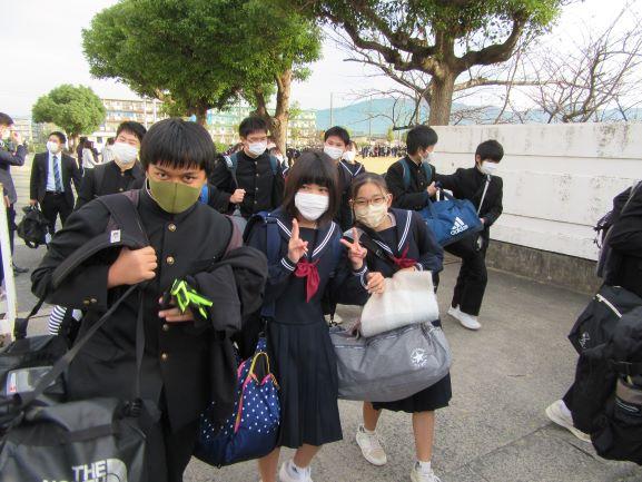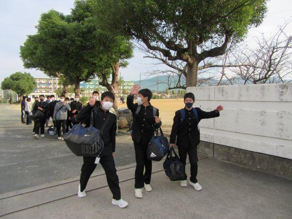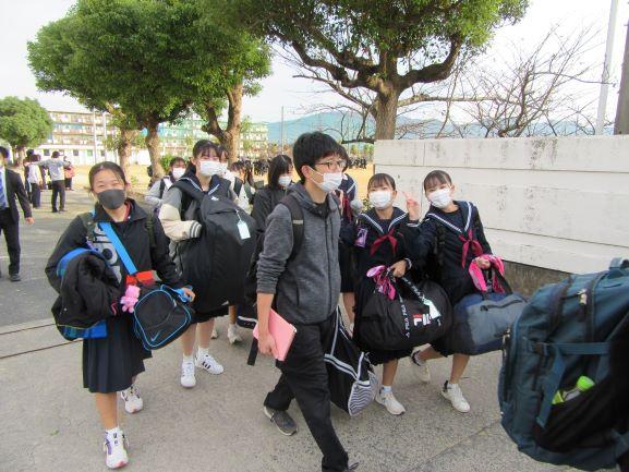 朝7時20分、3年生の生徒が運動場に集合しました。そして8時、大きな荷物を持ちながらも足取り軽くバスに乗り込み、元気に出発しました。今日は、富士山周辺で体験活動や見学を行い、山中湖のペンションに向かいます。