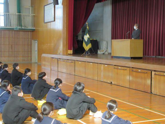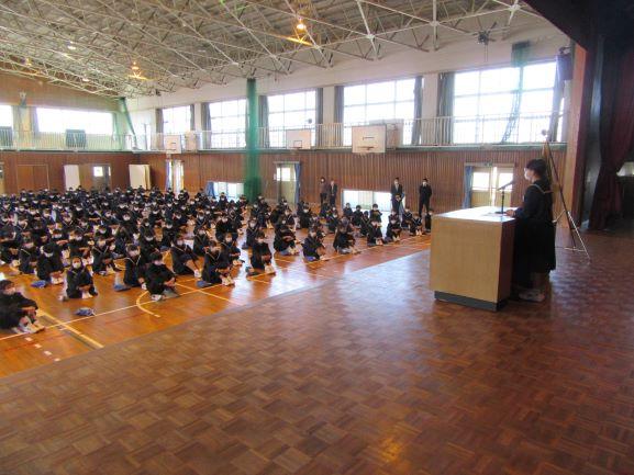 全校生徒が体育館に集まり、全校集会が開かれました。生徒会執行部、各学年級長会、各委員会より、今年度の目標とその目標に迫るための取り組みが発表されました。また、各部活動からも今年度の目標や夏の大会に向けての意気込みが語られました。「よりよい学校にしたい!」という生徒の強い意志が感じられる素敵な集会でした。