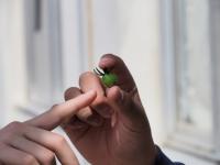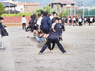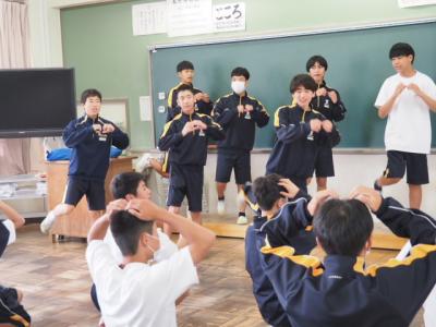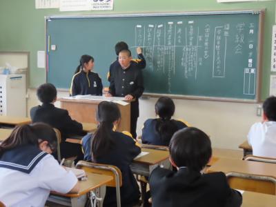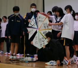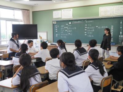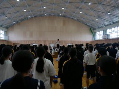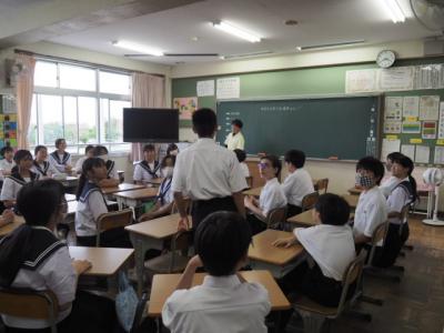 豊岡中学校では、①「テーマに対して自分の考えをもって発表する」、②「友達の意見に対してどう思ったかを発表する」、③「考えたことをふだんの生活にいかせそうか発表する」という三段階の目標設定のもと、「お話タイム」を行っています。