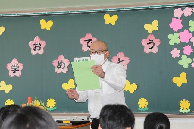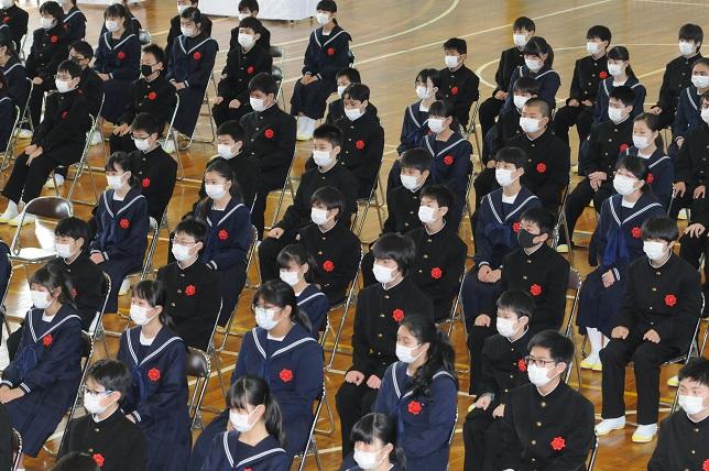 今年度は、コロナウイルス感染症拡大予防対策のため、1・2年生の参加はなく、保護者、教職員とともに行う式となりました。新入生は最初緊張した面持ちでしたが、学級の時間が終わるころには打ち解けた雰囲気も見られました。