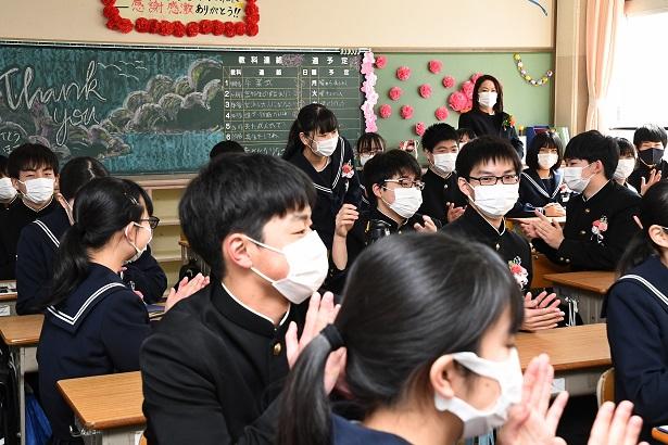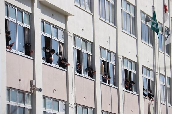 退場では、校舎窓から2年生が拍手で見送り、学級の時間の後、豊岡を後に巣立っていきました。