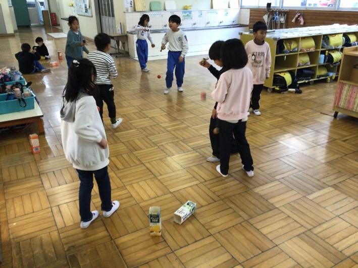 生活科の「むかしからのあそびをたのしもう」の授業でコマやけん玉などを楽しんでいます。