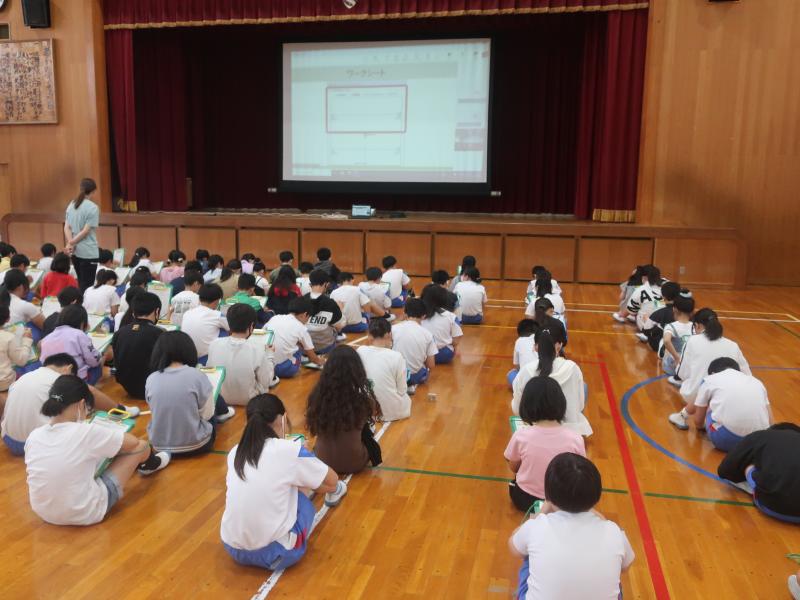 10月17日(金)3,4時間目にパラスポーツ体験型出前授業「あすチャレ!スクール」(主催:日本財団パラスポーツサポートセンター)で、車いすバスケットボールプログラムが行われました。パラリンピック4大会出場の男子車いすバスケットボール元日本代表の神保講師が来校し、体験型授業をしていただきました。授業前半では、実際に車いすを体験し、生活用の車いすと車いすバスケットボール競技用の車いすの違いを肌で感じることができました。代表児童数名でミニゲームも行いましたが、体育などで行うバスケットボールと違い、車いすに乗りながら行うバスケットボールに難しさを感じていました。授業後半では、神保講師の実体験を踏まえた講話を聞きました。けがをしてからも新たな夢を見つけ実現した神保講師のように、子どもたちは、自分たちも夢に向かって諦めることなく挑戦したいという気持ちを高めました。