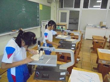 図工の授業では,電動糸のこぎりを使って木の板を切り,オリジナルパズルを作っています。初めて使う道具に戸惑いを見せながらも,どこから切ればよいか試行錯誤しながら,よりよい作品をめざして活動に取り組みました。