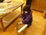 3年1組が図工室で、木をのこぎりで切っていました。上手に切れたかな。