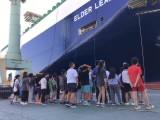 ラインに流れる自動車の組み立てや数千台の自動車が船の中に積み込まれる様子などを見るとこができ,初めてのことに驚いていました。