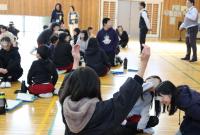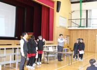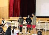 休憩時間には、豊の(自称?)お笑い芸人たちがショートコントを披露しました。リラックスした雰囲気のなか、後半のワークショップにうつります。今度は、それぞれがつくったカードをもとに「お題」に沿って言語化する活動を行いました。グループ内で取り組んだり、代表チームが対抗戦を行ったりして、楽しくコミュニケーションを取ることができました。参加型バトルでは、友達の取り組む様子を見て、自分たちも参加したい!と積極的に手を挙げるグループが増えていき、楽しんで文章を考えたり、たくさん話をしたりする姿が見られました。ふり返りでは、「中学校での自己紹介などに生かしたい」「こんなふうに自分についてあまり考えたことがなかったので、よい経験になった」「友達の発想のよさを知ることができて楽しかった」といった感想が聞かれました。