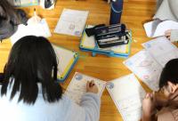 NPO法人マナビエルのスタッフのかたがたやお笑い芸人のかたが講師となって行う作文(ラクサクブン)のワークショップに、6年生が参加をしました。お笑い芸人さんのショートコントや、やわらかあたまタイムでの発想トレーニングで心も体もほぐした後、じぶんカードという自己紹介のカードを思いのままにかくという空色ことばワークを行いました。項目ごとに好きな数字や得意なことなどを書いていきます。カードには自分のキャラクターを描く欄もあり、3~4人のグループに分かれて楽しく会話をしながら作成していきました。