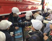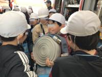 ホースや器具を持たせてもらい、あまりの重さにびっくりする子、すすんでメモを取ったり質問をしたりする子など、どの子も熱心に取り組んでいました。