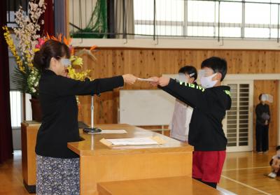 今日は修了式です。各学年の代表に、修了証を渡しました。代表児童の2年生、5年生が1年間を振り返った作文を読みました。なわとびをがんばったこと、生活三則を意識して行動できたことなど、日ごろのがんばりを発表することができました。「生活三則は、守らないといけないルールではなく、自分をよくしてくれることに役立つもの」という言葉が印象に残りました。なぜそれをするのか、どんな意味があるのかを自分なりに捉え、プラス思考で取り組むことができていることをうれしく思います。今年度も、「やってみよう」とさまざまなことに挑戦し、「できる」を増やせた豊っ子の様子について、校長から講話がありました。自分のがんばりや努力を肯定的に捉え、自信に変えていってほしいと願っています。