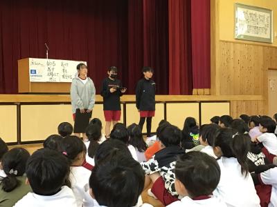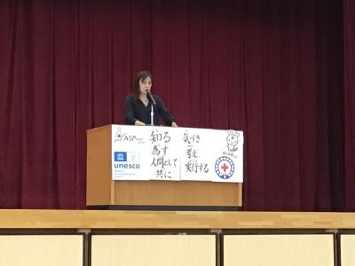 まず、校長から、本校が加盟しているユネスコスクールと青少年赤十字についての講話がありました。「知ることを学ぶ」「為すことを学ぶ」「人間として生きることを学ぶ」「共に学ぶ」というユネスコスクールの4つの学び、「気づき、考え、実行する」という青少年赤十字のめあてについてのお話でした。