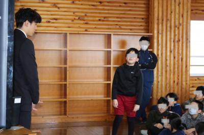 その後は、さっそく各学年からの出し物です。3年生は、学習発表会でも披露したアルファベットクイズを6年生に挑みました。2年生は、ジャンボリーミッキーのダンスを全員ノリノリで踊り、6年生に元気パワーを届けました。4年生は、文字を並べ替えて県名をあてるクイズを、かっこいいダンスとともに披露。「6年生はぼくたちわたしたちのあこがれです!中学校へ行ってもがんばって」と優しく力強いメッセージを贈りました。1年生は、縦割り班ごと、同じ班の6年生の名前を一人ずつ呼び、「遊んでくれて楽しかったよ」「読み聞かせ、うれしかったよ」とお礼を述べました。そして、「6年生はぼくたち・わたしたちのカリスマ!」とノリノリダンスを踊りました。途中からは、特別ゲスト(?)の6年担任H先生も参加し、キレッキレのダンスを披露。6年生は大喜びでした。5年生は、楽しいギャグを入れながら司会進行をし、会を盛り上げました。