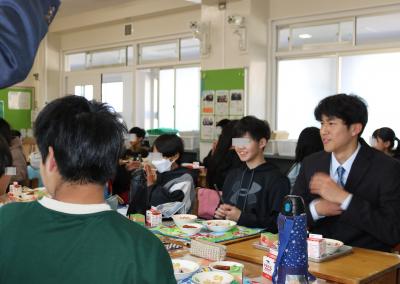授業の最後には6年生から校歌のプレゼント。陸汰さんと一緒に歌いました。給食も一緒に食べていただきました。