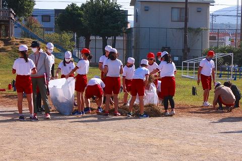 朝の時間と1時間目に運動会の全校練習を行いました。豊体操、入場行進、開会式の練習をし、その後で運動場の石拾い、草取りをしました。けがをせず、楽しく運動会ができるようにみんな一生懸命に作業しました。