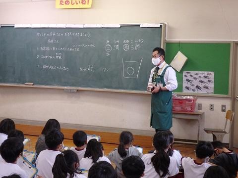 3年生が開拓の授業で校区の店舗やそこで働く人々について学習しています。今日はサンヨネ店長の高井さんに来ていただき、お店での工夫やコロナ対策についてお話していただきました。